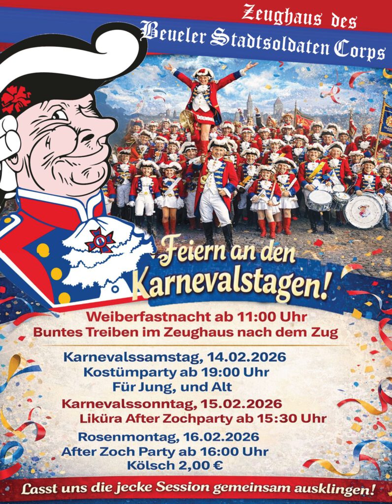 90 Jahre Beueler-Stadtsoldaten-Corps „Rot-Blau“ 1936 e.V. Am 15.11.2025 feiern wir 90-jähriges Jubiläum! Unsere Geschichte Die bewegte Geschichte des Beueler Stadtsoldaten-Corps „Rot-Blau“ 1936 e.V. haben unsere Literaten für Euch hier Jahr für Jahr fortgeschrieben: